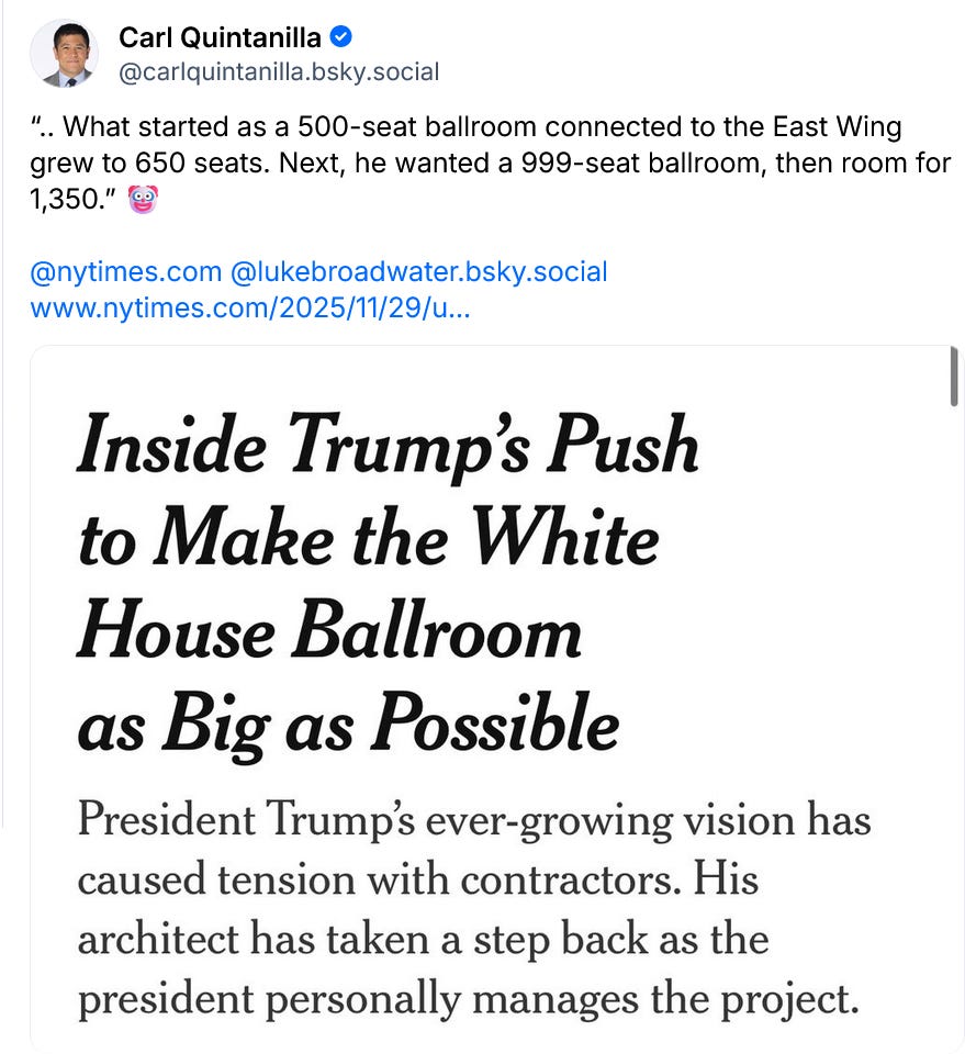 7 - The tearing down of the East Wing, the desecration of the world’s most important symbol of democracy, and his maniacal - and illegal - crusade to build himself a gilded ballroom has become unhinged and monstrous: