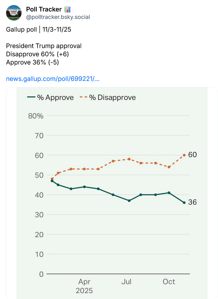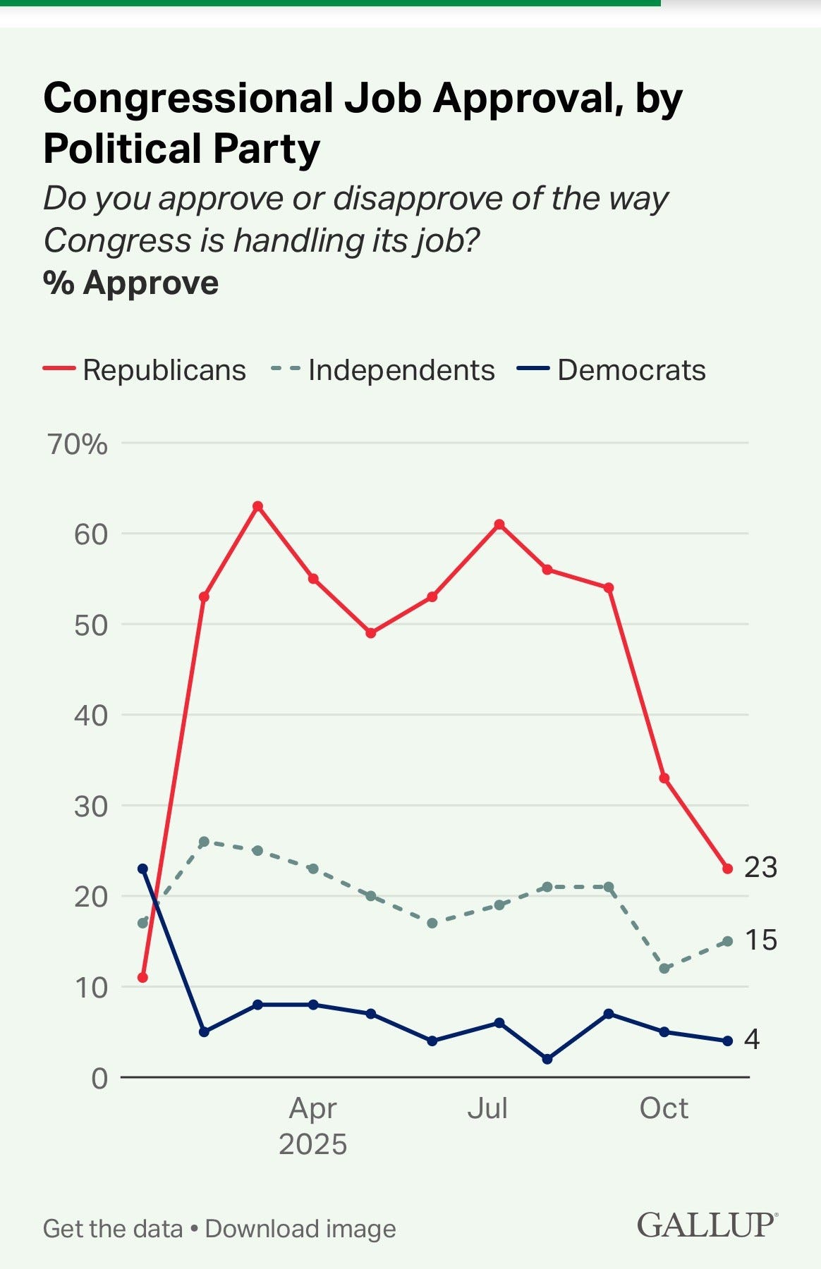 1 - Public rebukes, no confidence votes, Congressional chaos - Senate roll back of the tariffs; entire Congress voting to force him to end the Epstein cover up; a blow out election; having to defend a +22 Trump seat in Tennessee; Kennedy repeatedly skewered in Senate hearings; MTG’s emergence as an opposition leader; utter chaos on health care and the budget in Congress.
