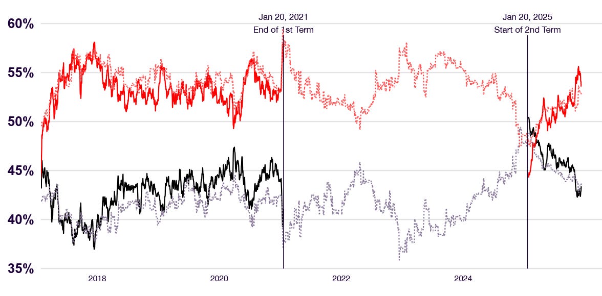 Democrats must take this new effort seriously, and develop a comprehensive strategy to keep the hard negatives of his “more for me, less for you” tenure front and center for voters, particularly low political information voters. Part of the big lesson from 2023-2024 is that when we are not communicating about the harms and dangers of MAGA Trump can recover. Here is Real Clear Politics’s Trump job approval tracker with black approve, red disapprove. On Jan 20, 2023 Trump was 37.7%-56.8% (-19), similar to where he is now in many polls. On Election Day, 2024 he was 44.9%-51.9% (-7) - a gain of 12 points.