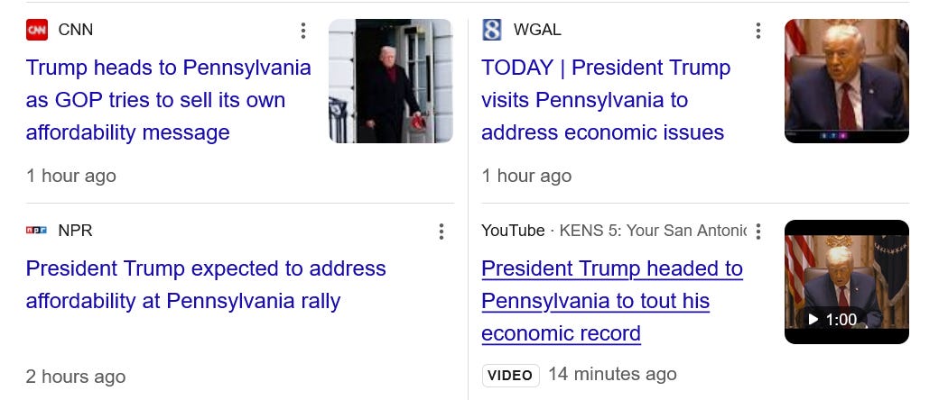 Today Trump heads to Pennsylvania for the first stop in a new tour to rebrand him as a champion of affordability and working people. Let’s be clear that Trump, facing terrible poll numbers for his terrible first year, isn’t changing policy course - he’s just going to launch a year long campaign backed by tremendous amounts of money - some ill-gotten - to memory hole this first year and bullshit the public.