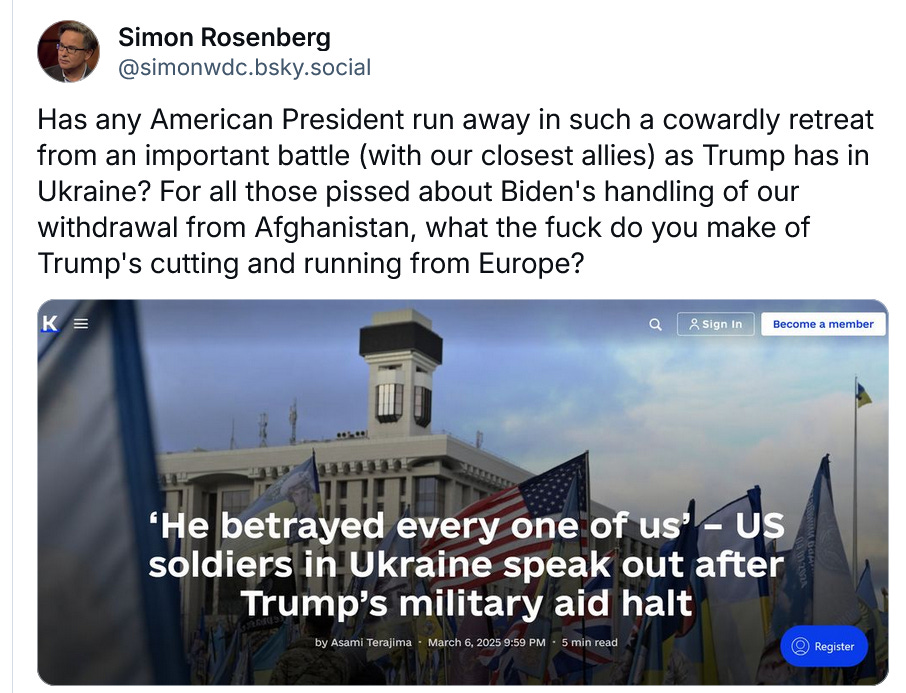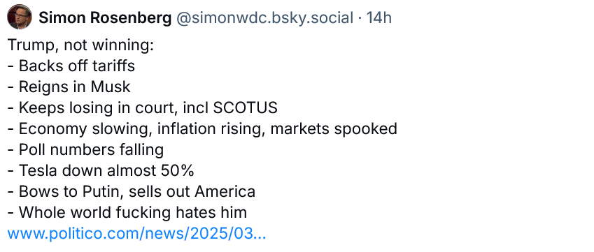 Let’s review these last few days. It is become clear to all Trump’s policies are tanking the incredibly strong economy he inherited. His poll numbers keep dropping. Consumer confidence has plummeted. The markets are spooked. In what was perhaps the most cowardly thing an American President has ever done he sold out America to Putin and ran screaming RETREAT from Ukraine and Europe. Yesterday he had to rein in Musk, for as we discuss in my new video and post what he (and Trump) have been doing is wildly illegal, unconstitutional, doing incredible harm to the country and is causing them to keep losing in court, again and again, even in his own servile Supreme Court this week. Yesterday Trump just backed off his Tuesday tariffs with Canada and Mexico with no deal. He just retreated. In this past week he surrendered to Putin. Retreated on Musk. Retreated on tariffs. Trump is a weak man, not a strong man. Part of our job here at Hopium is to keep pulling the curtain back on the Wizard, every day. And this week we’ve seen a bumbling, cowardly, unstable leader losing again and again and in retreat.