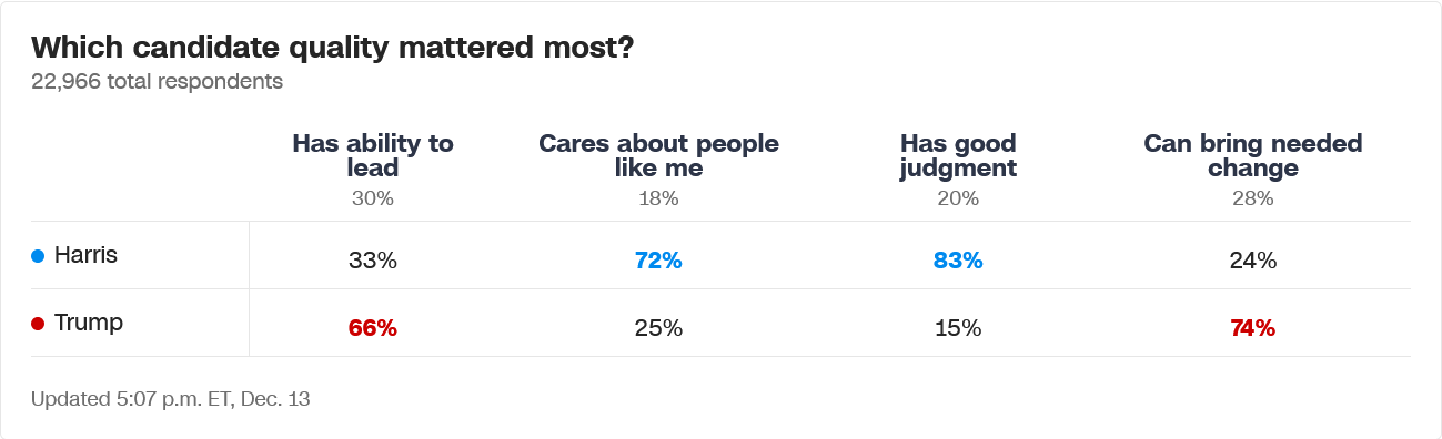 Here’s why as we proceed Democrats must focus now not just on being right but also on being strong. Voters think our hearts are in the right place, and that we want to do the right thing. They just don’t believe we are strong enough to do what it takes to deliver for them. Here’s that 2024 Exit Poll data I often cite - Trump wins strong enough to “bring needed change” by 74%-24% (50 points):