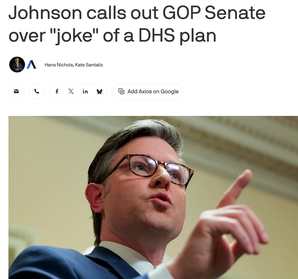 In hindsight, Senator Thune’s decision to defy Trump last week and unanimously pass a bi-partisan DHS appropriations bill without ICE/CPB funding or the SAVE Act was perhaps a bigger moment in the cracking of the regime than we all understood at the time; and why Speaker Johnson, and the White House, so aggressively and recklessly lashed out at him. Again, for those wondering whether the two parties could come together in some sort of national unity government to wrest control from or more directly challenge the madman-in-chief, Thune’s act of rebellion was perhaps a sign of the growing realization of how grave the crises are that Trump has created for the world, and for the Republican Party, this November.