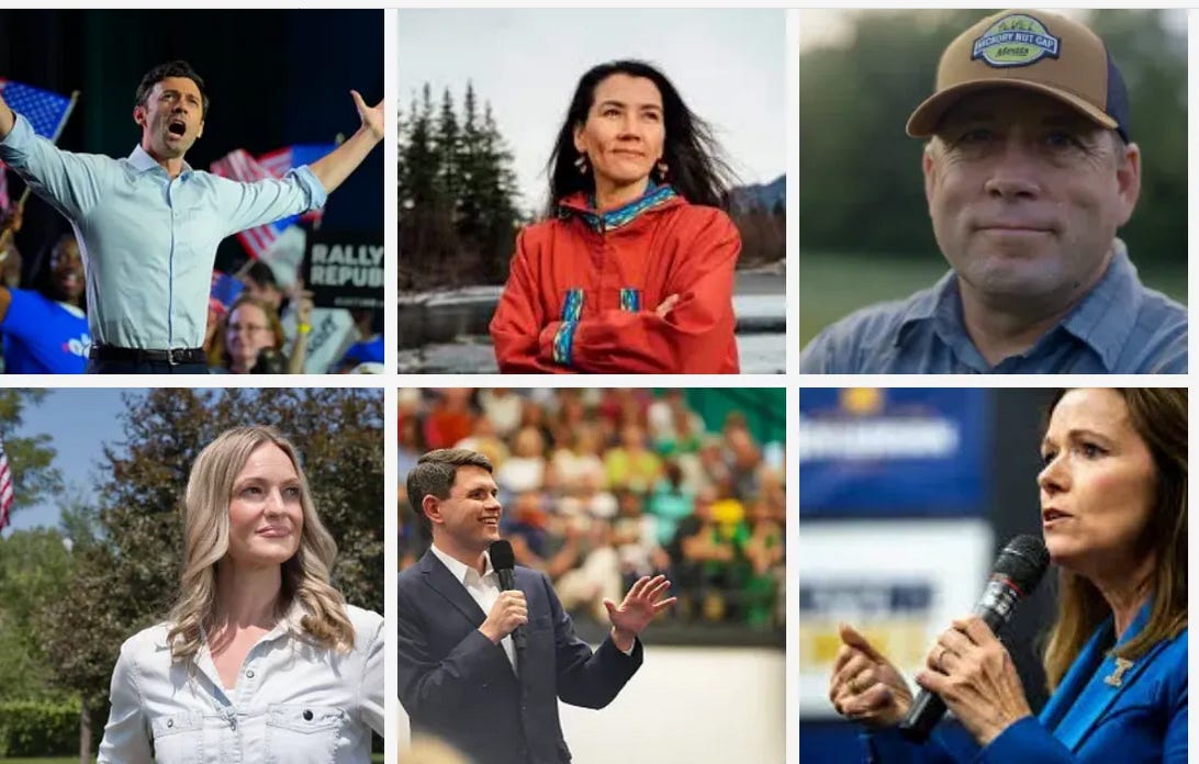 From upper left, clockwise - Jon Ossoff, Mary Peltola, Jamie Ager, Christina Bohannan, James Talarico, Paige Cognetti
