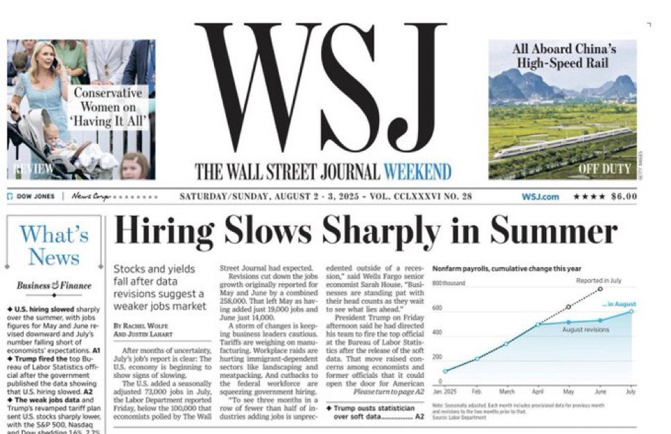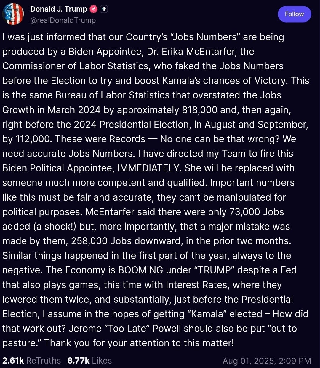 Morning all. The Big Blubbery Baby Man had a really bad week and he ended it by throwing a wild tantrum yesterday, firing BLS chief Dr. Erika McEntarfer. Deeply respected, Dr. McEntarfer had broad, bi-partisan backing for her appointment, and was confirmed by the Senate for her position, 86-8. Here is what the crazy person running our country “truthed” yesterday: