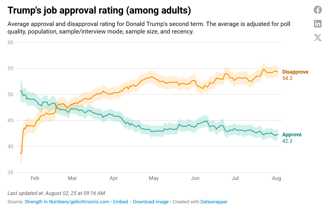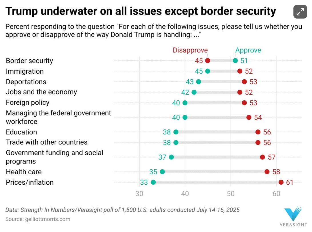 Last week I wrote to you that things were bad for Trump but were likely to get worse. And they have. The economy has slowed, inflation has been re-ignited, the deficit is growing, ACA health care premiums are skyrocketing, interest rates remain too high, he has looked all week like a vainglorious asshole, and the American people increasingly understand they’ve been betrayed and are becoming ever more distant TO HIM. If Trump implements the tariffs on Thursday things will get worse; if the big ugly is implemented without change things will get worse; if Stephen Miller really tries to remove 10-15 million people from the country things will get worse; if Trump fires Chairman Powell and god knows who else things will get worse; if the government shuts down this fall things will get worse; if tens of thousands of children starve to death in Gaza things will get worse; if China, as Rob Shapiro has warned, starts to sell off our Treasuries, things will get worse, a whole lot worse.