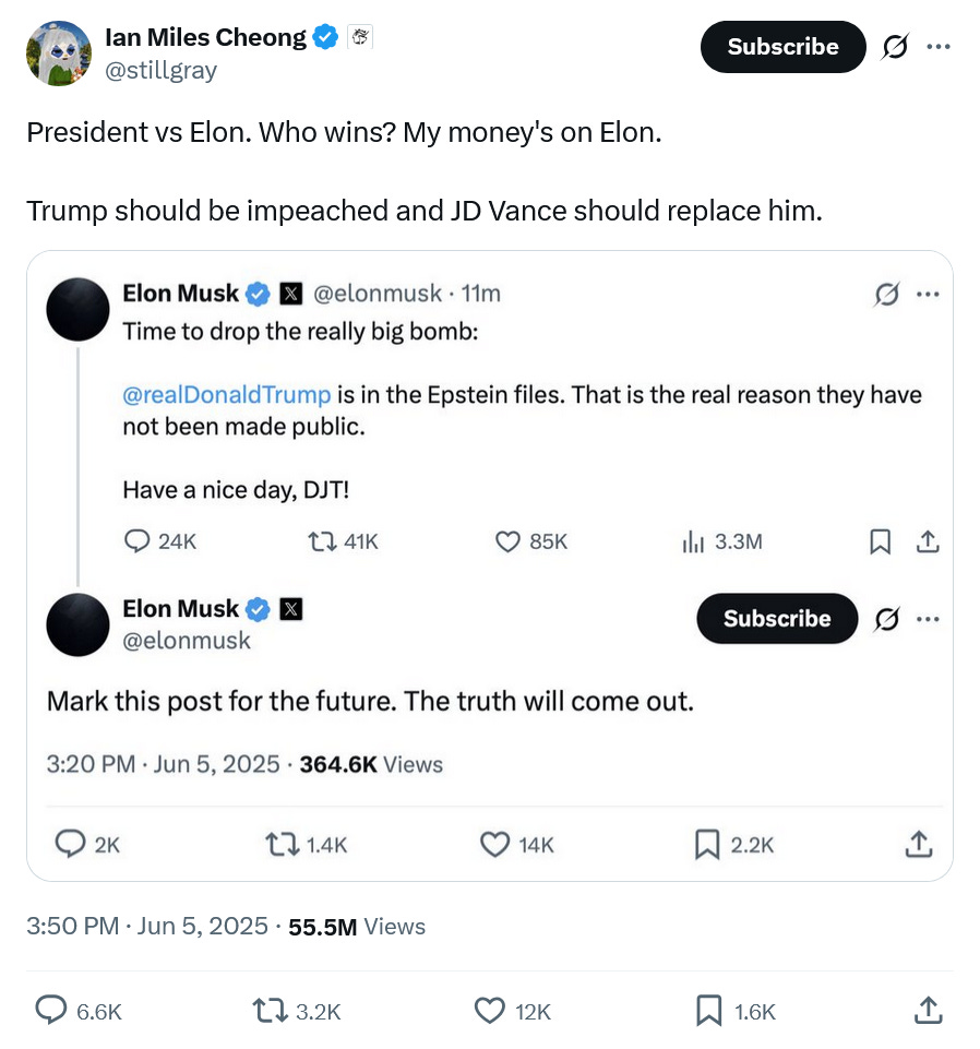 The anger and “off with her head” rage exploded yesterday for Trump has had a remarkably bad last two months and the “success” of his tariffs and economic plan had begun the process of restoring his STRENGTH and POWER. This period of struggle and decline, of weakening and losing, began with Elon’s three day long Twitter attack that introduced the Epstein files to our discourse and deeply wounded Trump.