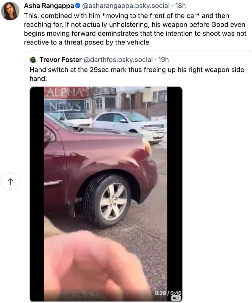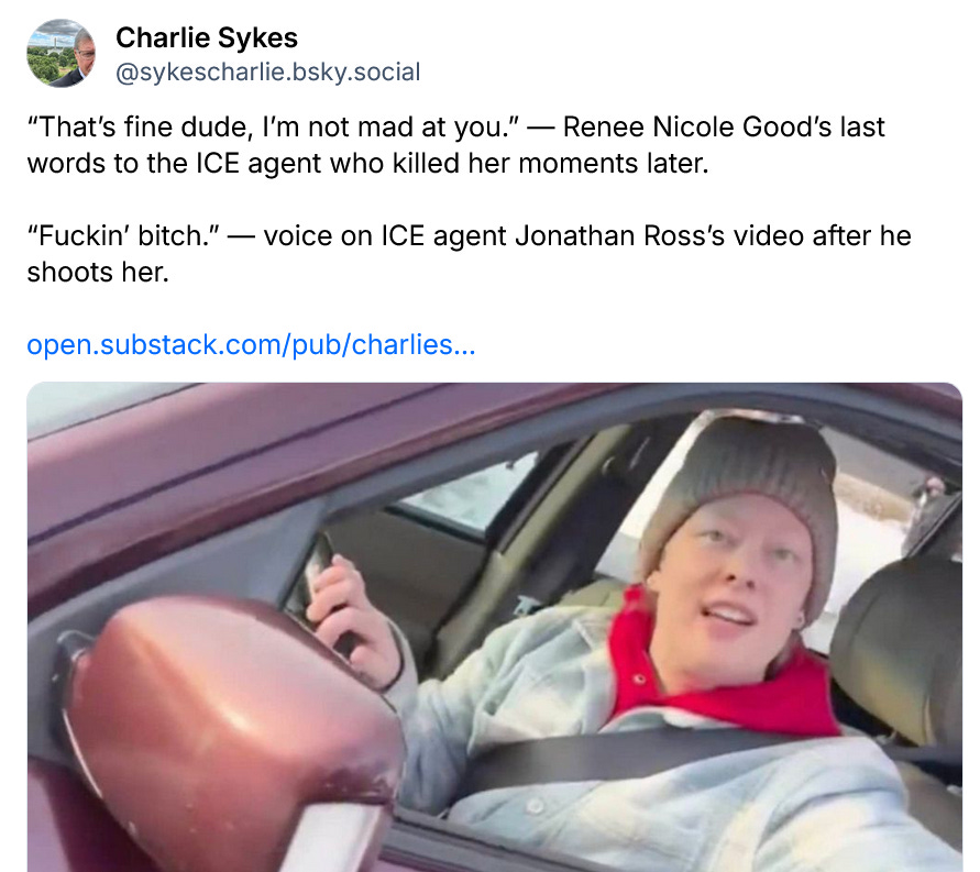 I am not going to write about Renee Nicole Good, and what is happening in Minnesota today. For my heart is heavy and I need a day off. I will, however, share this post below about the new video Agent Ross, the killer, released yesterday, the one where we see Good trying to de-escalate and where Ross spits out “fucking bitch” after killing her.