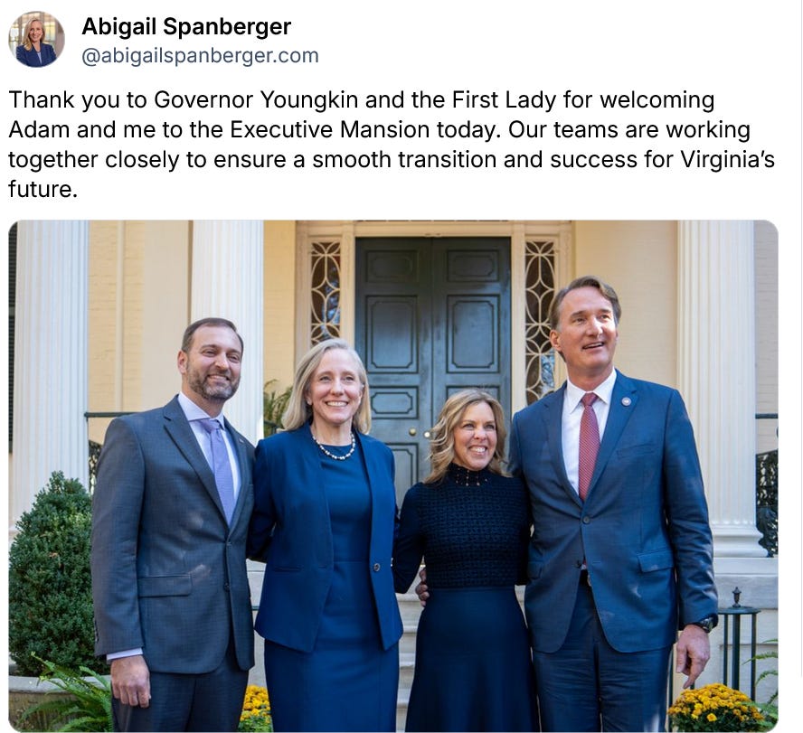 BTW, we're watching Youngkin try to create his non-MAGA personality so he can run for VA Senate against Mark Warner. He moved quickly on SNAP and is being nicey-nice to Spanberger. Another Republican who's moving away from Trump. He's slippery and slimy, but you don't need to be a weather man to see which way the wind blows.