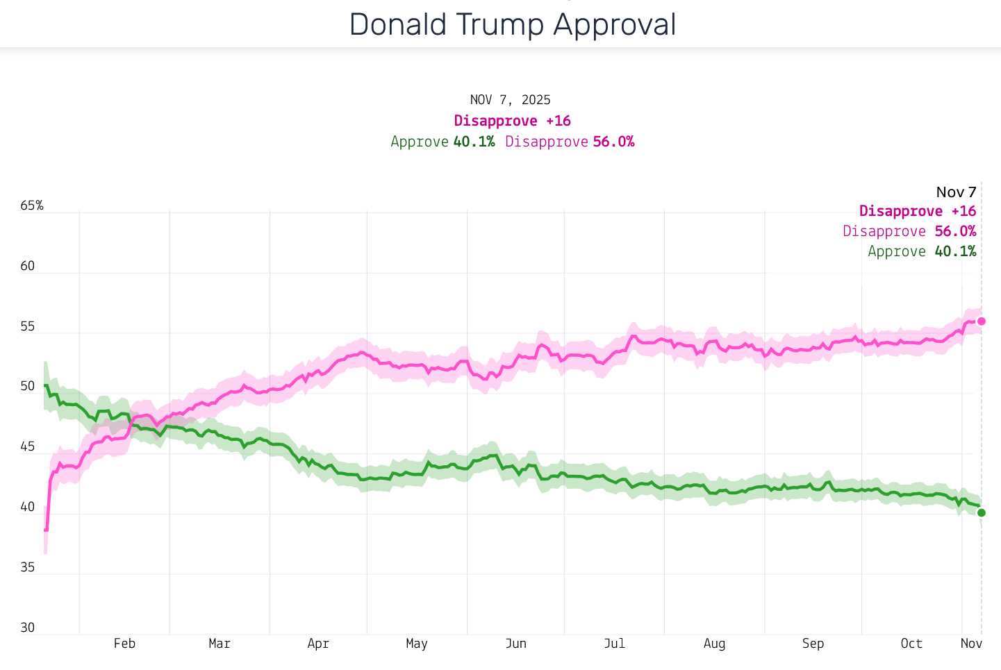 As we’ve been discussing here as the perception that his powers had begun to ebb grew cracks would start to appear in his support here in the Capital. Which is what is happening now. We’ve seen it in the House vote to release the Epstein files in July; in Johnson’s absurd and comical decision to keep the House from returning; in Marjorie Taylor Greene’s daily taunting of them; in the calls by House Republicans to cut a deal on the ACA subsidy cuts; in the three Senate votes last week to roll back the terrible tariffs; in their voters not showing up for their candidates on Tuesday; in what was a rough day for Trump in the SCOTUS arguments on the tariff case on Wednesday; in another humiliation for the DOJ when a jury came back with a “not guilty” verdict against the DC sandwich guy yesterday; in his own admission on Wednesday that the shut down has hurt him and the Republican Party; in Judges growing more ambitious in their rulings, like the one from yesterday requiring Trump to pay full SNAP benefits TODAY: