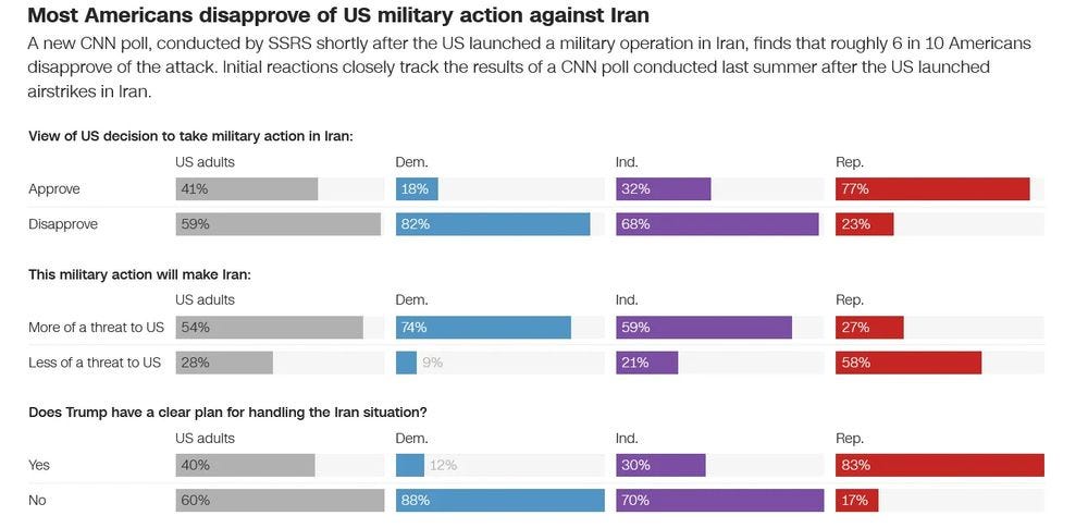 Do we think Trump believed that the country would rally around his vainglorious new war, a war that he promised, dozens and dozens of times that he would never wage? Early polling has shown little support for the war, and a remarkable degree of opposition. Here’s CNN’s new poll - fully 59% opposed already, before any of the clear harms of the war have been felt by Americans: