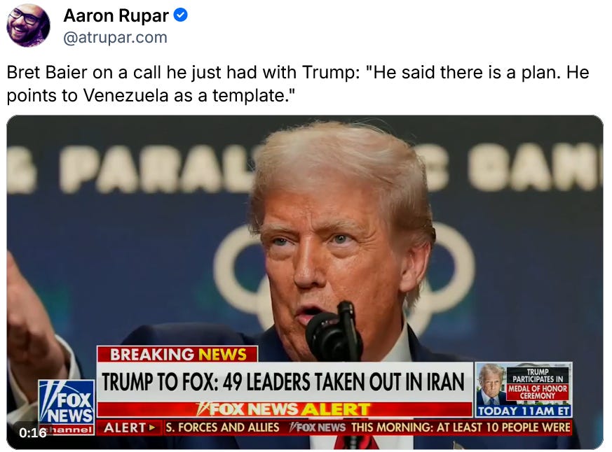 As I discussed with Rep. Adam Smith last night, and wrote about yesterday, it’s pretty clear now Trump just winged this war. They’ve struggled to articulate a strategy or objective these past few days for they can’t admit the real reason why America just launched a major war in the Middle East - because the big blubbery baby man wanted to. That’s it. That’s the reason. Yeah Bibi and MBS pushed him, perhaps Vance too, but our addled, ailing, Mad Leader made the call. He wanted a war and so now we have one. A big one.