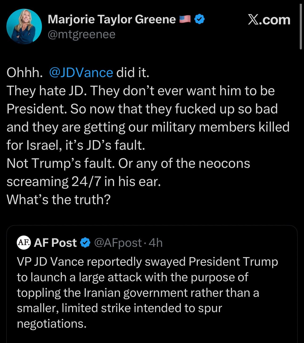 There is now reporting that the White House is blaming JD Vance for pushing for war rather than limited strikes. Again, this suggests that Trump may not have been fully aware of what has happening and what the consequences would be if we went to war: