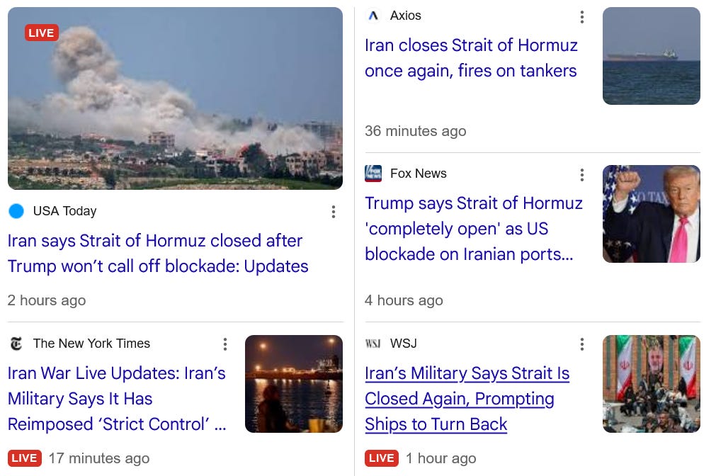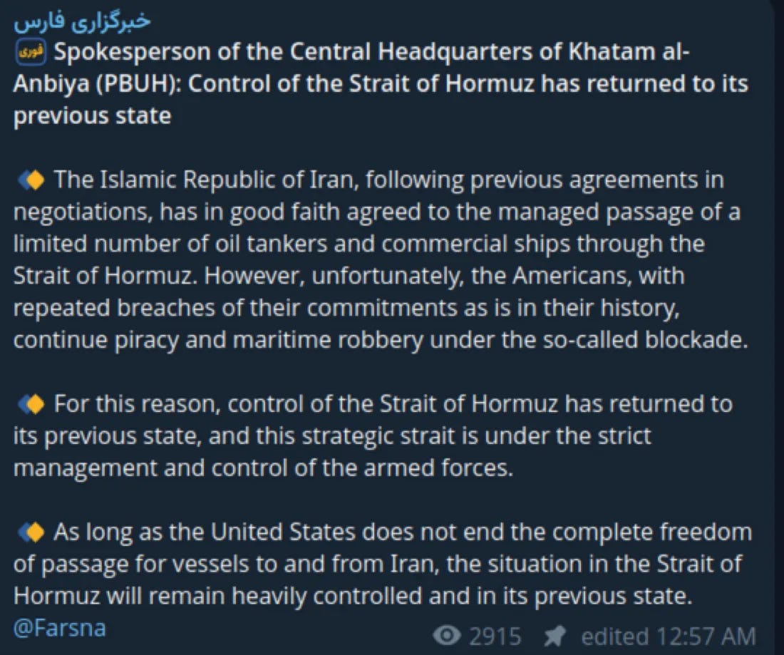 Morning all. Yesterday, Donald Trump, once again, tried to sell the world a wildly implausible and false story about the peace negotiations with Iran, a story that made it appear that Iran had made major concessions to our STRONG and MIGHTY leader. The Strait was open we were told. The Iranians had agreed to give up their nuclear program our addled leader told the world. Essentially what Trump sold to us was yet another imaginary Iranian surrender, which as the Iranians have made clear over the last 24 hours, did not happen. They have not agreed to end their nuclear program, not agreed to re-open the Strait while Trump maintained his blockade. Here is an Iranian statement this morning:
