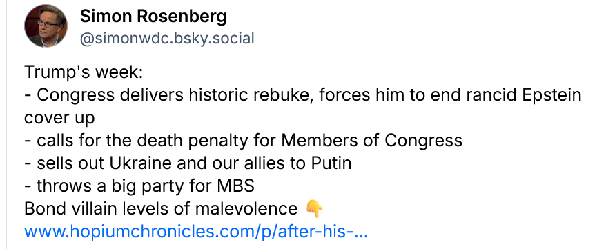 I asked Adam to come by to talk to us about what’s in the headlines now and what we discuss in this morning’s post - Trump selling out Ukraine and our allies to Putin; his threats against Democratic lawmakers; the build up of our military off the coast of Venezuela, something Adam refers to as “an invasion force;” and Trump’s clear political decline, his growing desperation, and our impressive string of consequential wins.