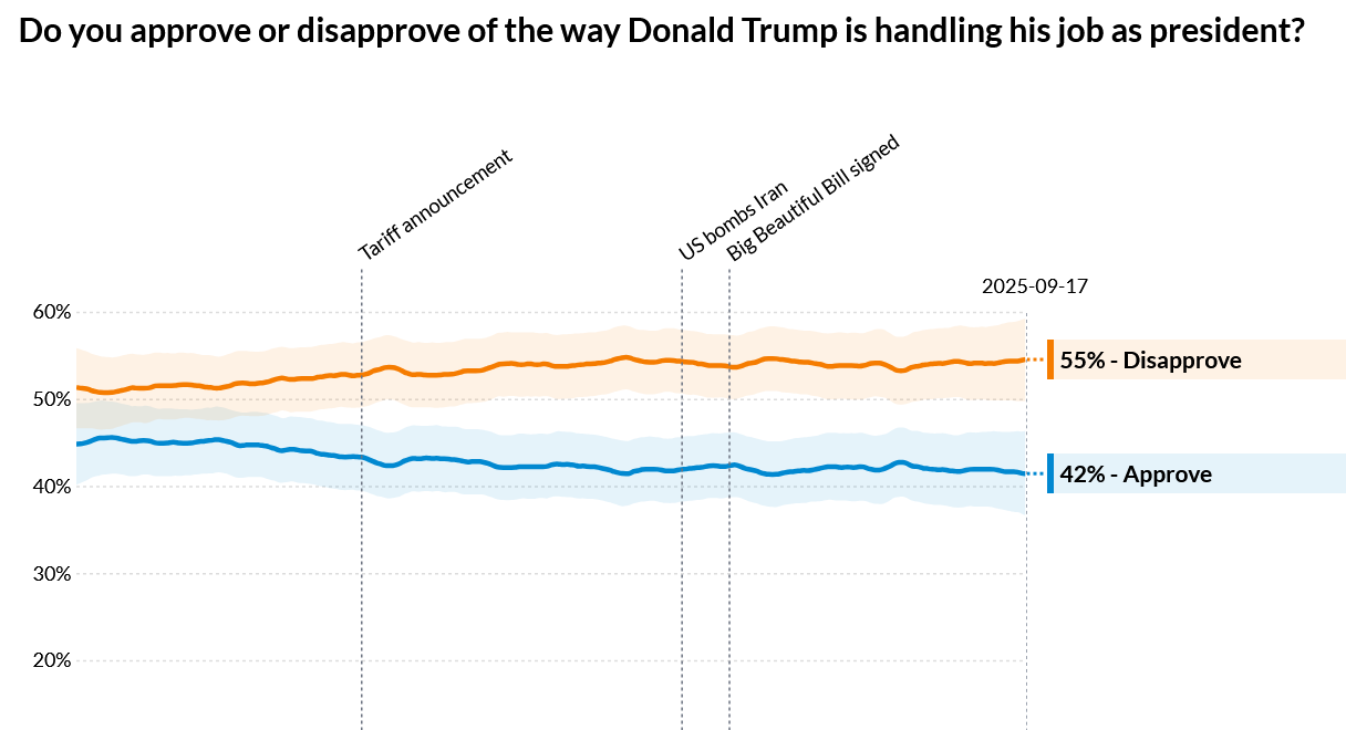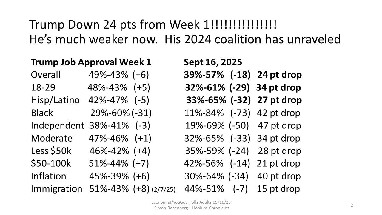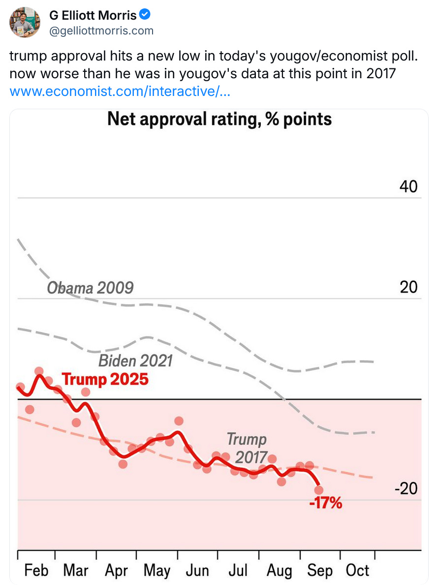 Two major tracking polls released show Trump at his lowest point this year and dropping in the past week. A majority of the country has rejected their illiberal and authoritarian response to the killing of Charlie Kirk as they have rejected every other strongman action Trump has taken this year: