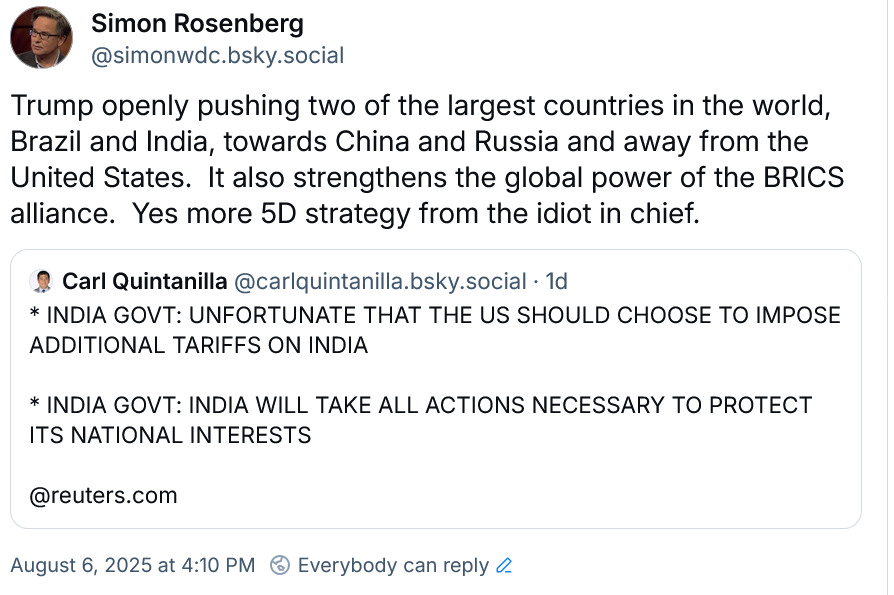 It’s why we have to keep working as hard as we can everyone, and work together to keep the momentum from these last few weeks going. Trump is weakening, and the central driver of that weakening is his terrible tariffs and the economic and geopolitical harm they are bringing. We need to be leaning in much harder about talking about these harms, and continue to take it to him even in these sleepy summer days in August. These tariffs are not only the most outrageous abuse of power by a President in our history, it is hard to imagine a greater betrayal of the American people themselves as these tariffs will raise costs on goods not lower them; continue to disrupt small businesses who cannot absorb the price increases or the supply chain disruption; weaken the American-led global system that has kept us prosperous and free; and will accelerate Trump’s goal of shifting the tax burden from him and his friends to all of us.
