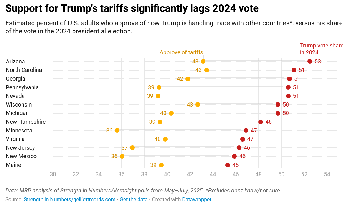 We know from data that a central driver of the Trump/GOP decline has been the terrible tariffs and the higher prices they are bringing. Today G. Elliot Morris has a new deep dive on the tariffs and how they are playing the battleground states. Here are his estimates (spoiler alert - badly):
