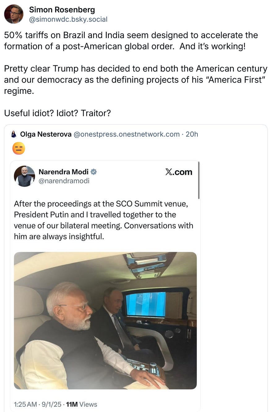 Morning all. Hope you rested up these past few weeks for this is going to be a very consequential fall. We have critical elections in two months, and early voting starts in Virginia in seventeen days. Congress will somehow have to pass a budget for the 2026 fiscal year and keep the government from shutting down. Trump’s physical, cognitive and political decline - his ebbing powers - has become impossible to ignore. The sordid and terrible Epstein coverup will roar back onto the national stage this week. The dangers of the medieval Trump-Kennedy assault on our public health is now front and center in politics, as it should be. Our Capital is occupied, and the sundowning madman is threatening to have our military - not DHS, FBI, ATF, DEA - begin invading American cities. His illegal and unconstitutional tariffs - the greatest abuse of Presidential power in America history - are increasing prices on everything for everyone. More have begun to question the financial integrity of our country and we are seeing early signs of flight from the dollar. Trump will continue to try to surrender to Putin and Xi, while Europe, and a few (far too few) of our leaders here will keep ferociously working to stop him.