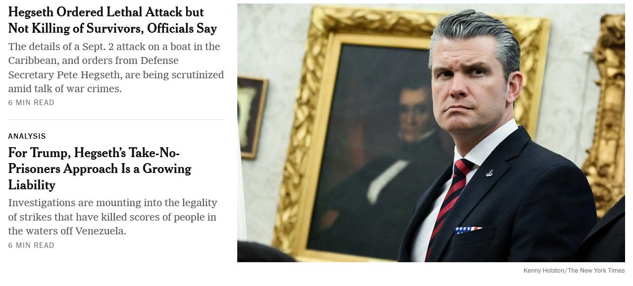 PS I can only think of one truly logical reason why Trump and Hegseth wanted there to be no survivors, and why, when it appeared there might be, they launched another missile to ensure there wouldn't. True to the Mafia ethos he has lived his entire life by, Trump and his yes man wanted to enforce omerta, to ensure there would be no loose ends, no one left alive to talk, no one who could credibly reveal their boat was carrying cocaine, not fentanyl, that they were bound for Europe or Africa, not the US, or most damningly of all, that they weren't trafficking drugs at all.