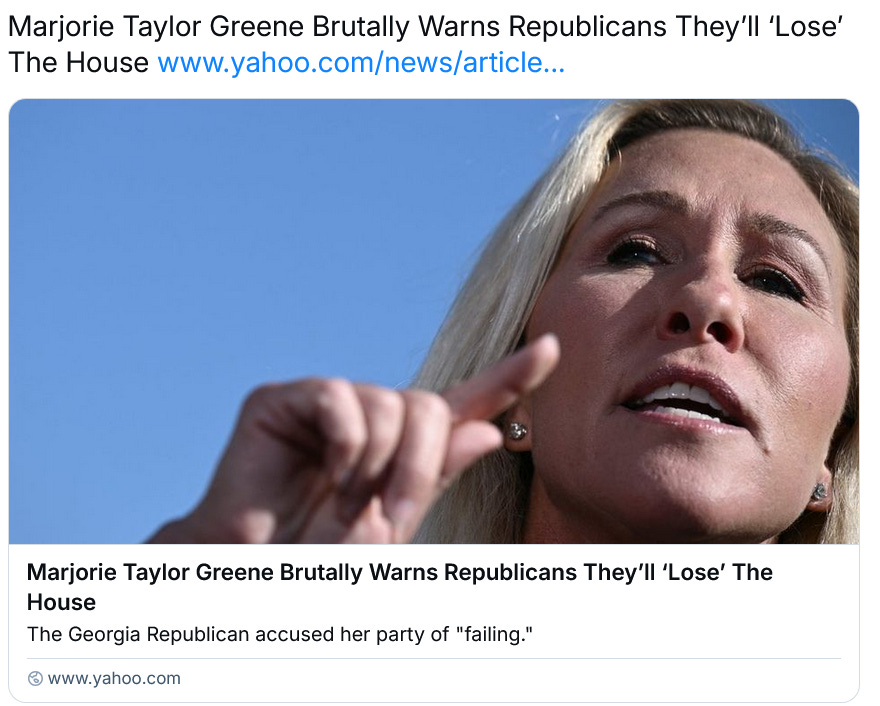 As this new Politico article explains, Republican leaders are far apart on how to proceed with process of passing a new continuing resolution, and HAVE NOT EVEN BEGUN THE PROCESS OF NEGOTIATING A FISCAL YEAR 2026 BUDGET AND IT’S FUCKING OCTOBER 23rd, 24 DAYS AFTER THE BUDGET WAS REQUIRED BY LAW TO BE IN PLACE. Literally, no joke, the discussions right now are on whether to punt the process to next year, even to after the 2026 election, and not about the budget and the very hard choices ahead. What this article describes, in cleansed insidery DC speak, is a governing party totally melting down.