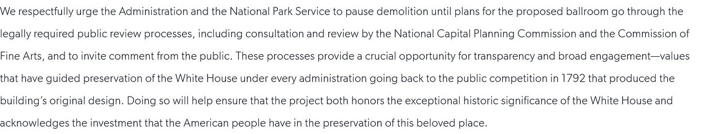 To be very clear what Trump has done to the East Wing is illegal. Here is a passage from a letter the National Trust for Historic Preservation sent to the White House on Tuesday: