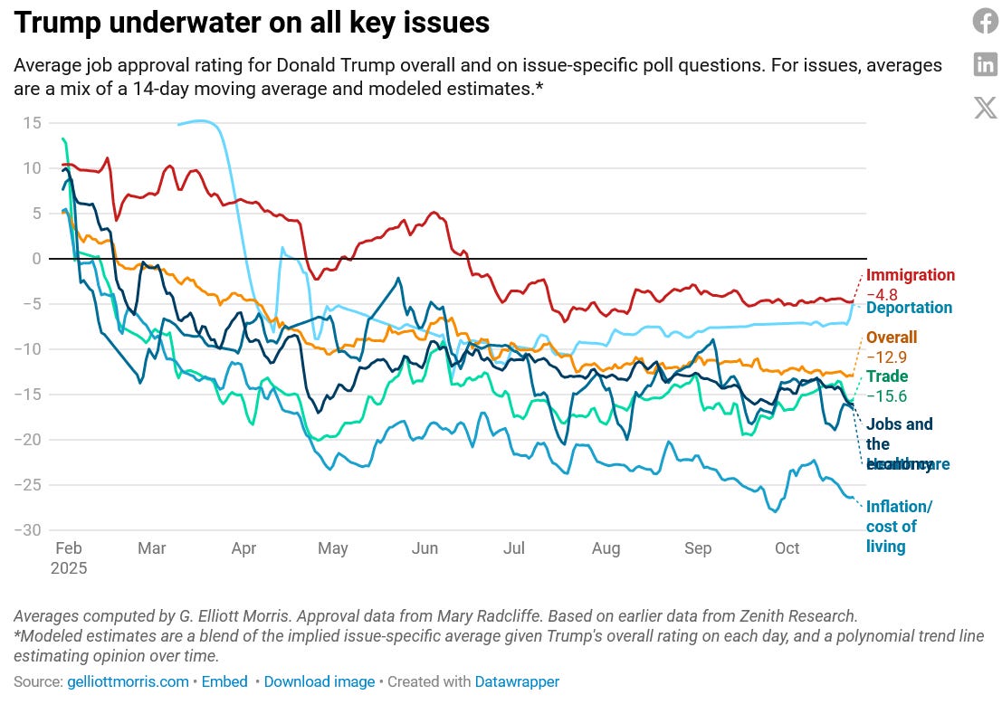 Additionally, in the last few days we’ve gotten a steady stream of you just have to be f-ing kidding me stuff from Trump, clear signs that he’s become a completely out of control madman that needs to be reined in - the illegal tearing down of the East Wing and the building of an imperial ballroom; the announcement that he is going to just take $230m from the Treasury for himself; the corrupt indictments of his political enemies; the illegal killing of people in the Pacific and Caribbean; the outrageous $40b bailout of Milei in Argentina; the resignation of the Southcom commander; his willingness to negotiate with Hamas but not Democrats here in the US. All of this is creating additional pressure on the Rs to say enough, we have to change course here. We can’t sell you and this stuff to our voters.