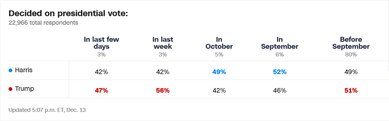 Morning all. We have a week left in the 2025 elections and need to keep working it. Vote early, donate, volunteer - let’s do everything we can to close strong and win these things. Grateful for all the work this community has done but we cannot let up now. We should all be inspired (haunted?) by this data from the 2024 Exit Polls - elections can be won, or lost, in the final week: